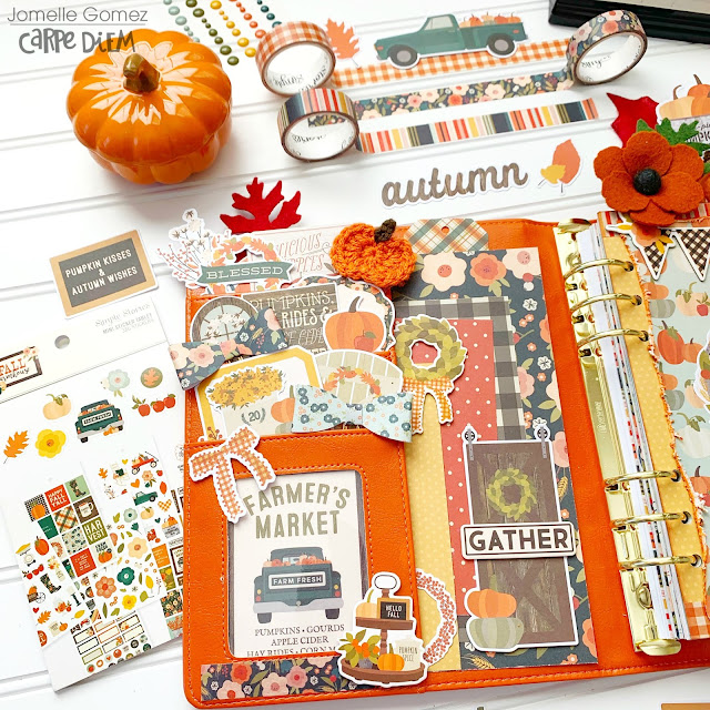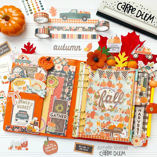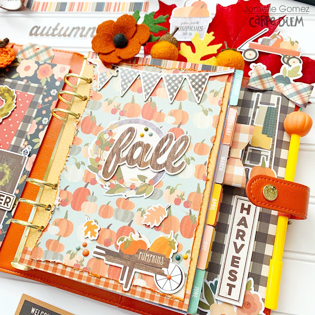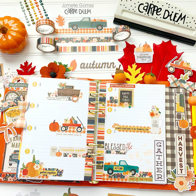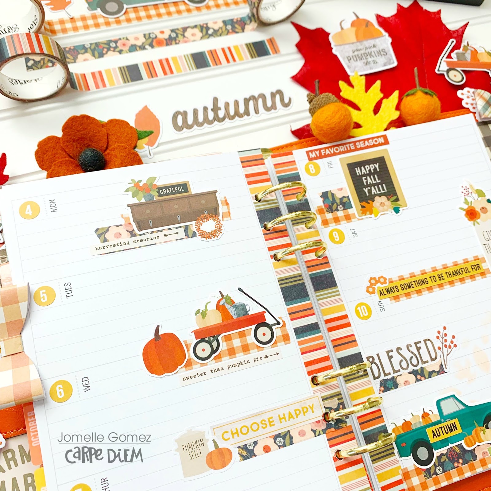 Fall is all about pumpkin picking, apple picking, wearing sweaters and boots, and pumpkin spice everything. Here I created my dashboard by layering couple of different papers and adding the chipboard stickers. I distressed the edges and added orange ink to give it more texture. I also added washi tapes on the top and bottom border.
